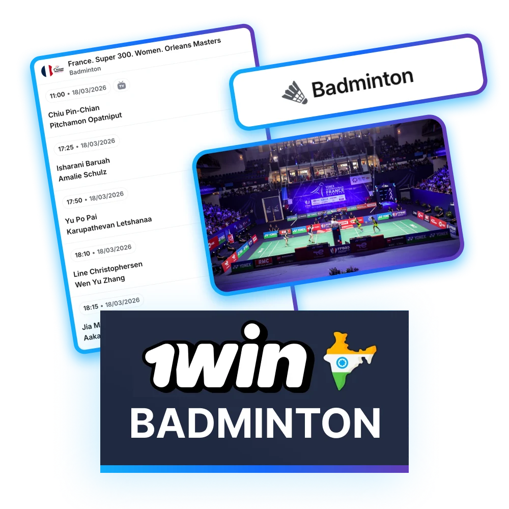 Badminton betting on 1win gives you access to matches across Singles and Doubles formats. The number of events depends on the season, so the match list updates during the year. You can place pre-match bets, use live odds, and all other features of our site. To get off to a flying start, new users can claim a welcome bonus of up to 500% on their first four deposits, up to a maximum of INR 180,000.